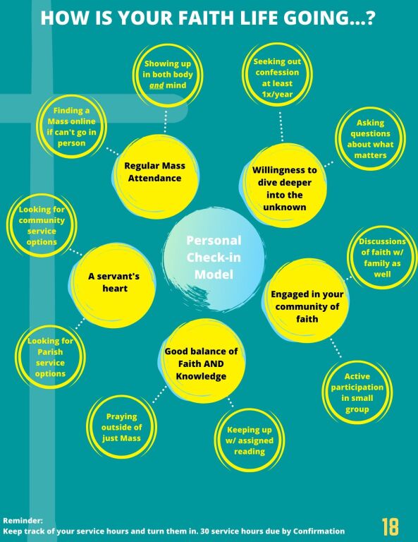 All service hours for students should be turned in to the Religious Education Office. All parish high school students are expected to complete 30 hours of service by Confirmation. Of these 30, 15 hours should be for the community and 15 hours should be for the parish. Youth are encouraged to turn in completed service hours to the Religious Education Office on a regular basis. Service transcripts are available on request . Teens are also encouraged to continue turning in hours even after reaching their 30 required hours as a way of tracking service experiences for when it is time to apply for college scholarships.